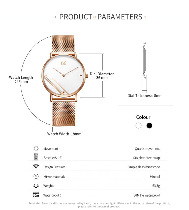 | About Dial | Case material: Stainless Steel Display type: Analog Movement type: Quartz watch Shape of the dial: Round Watch mirror: Mineral glass Dial size: 32MM |